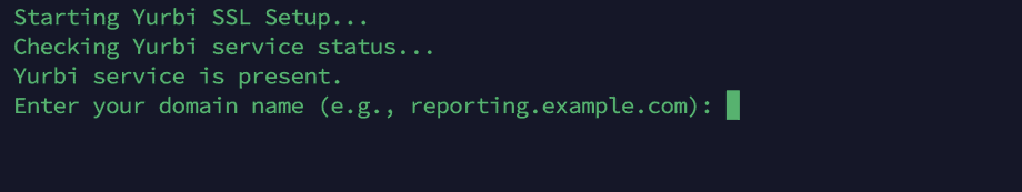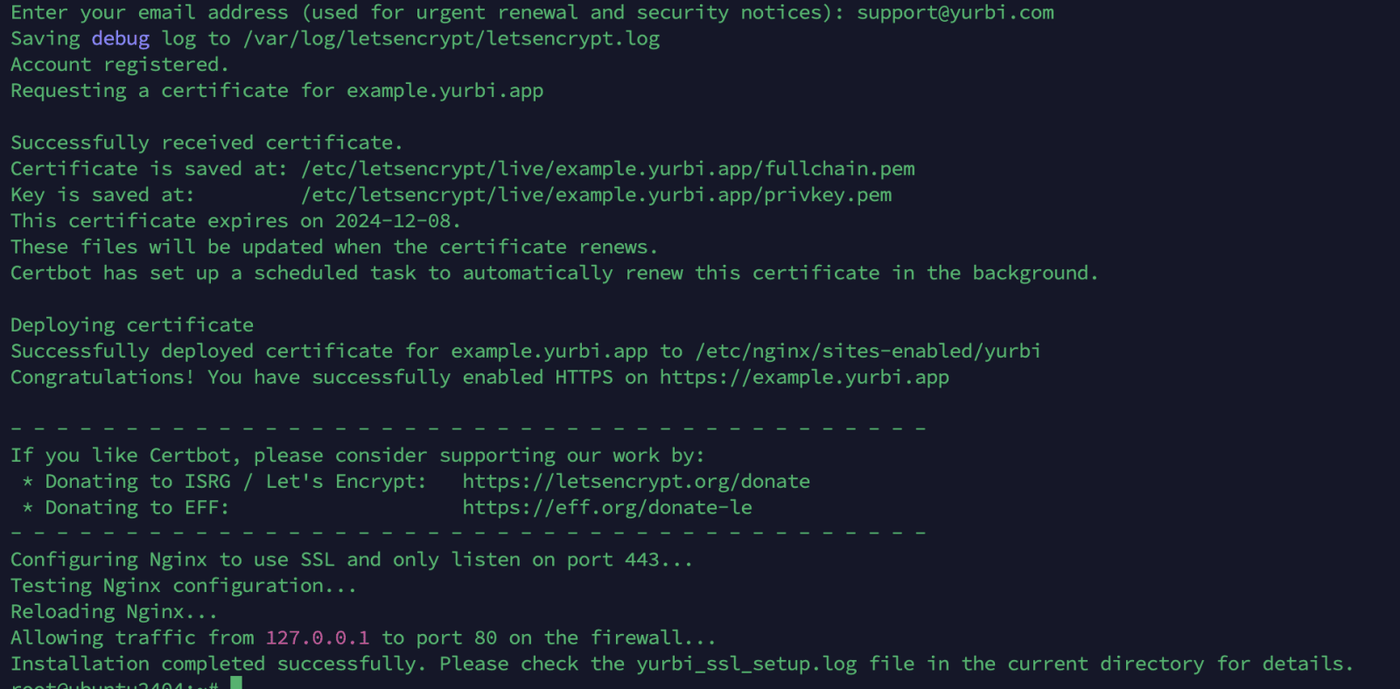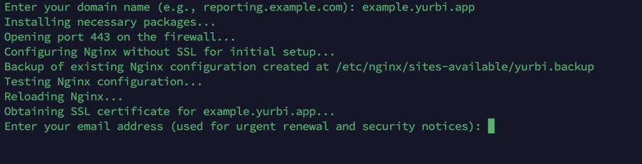 The script will proceed to provision the SSL certificate and set up NGINX, the firewall ports, and Yurbi to use the SSL certificate over port 443.