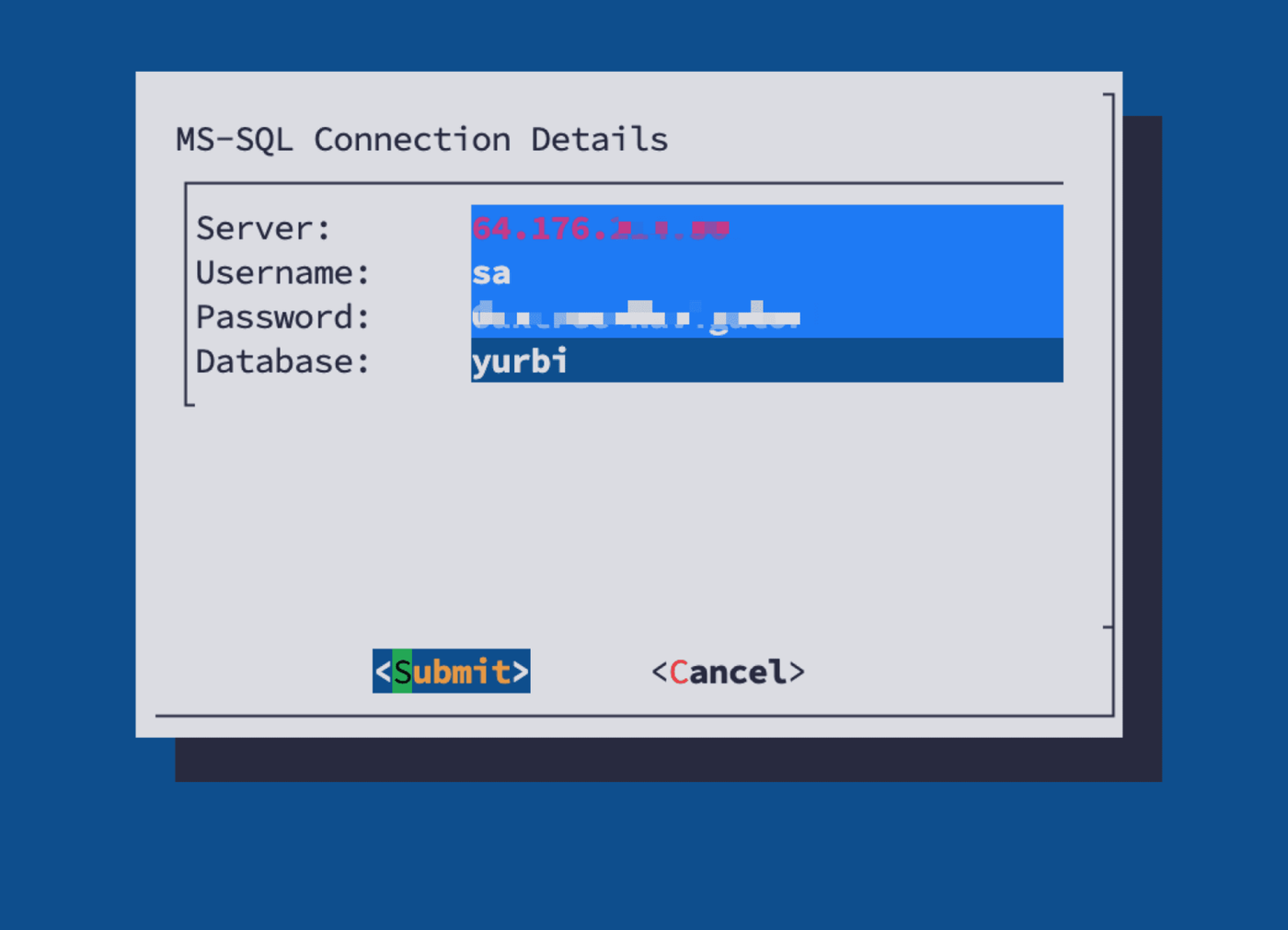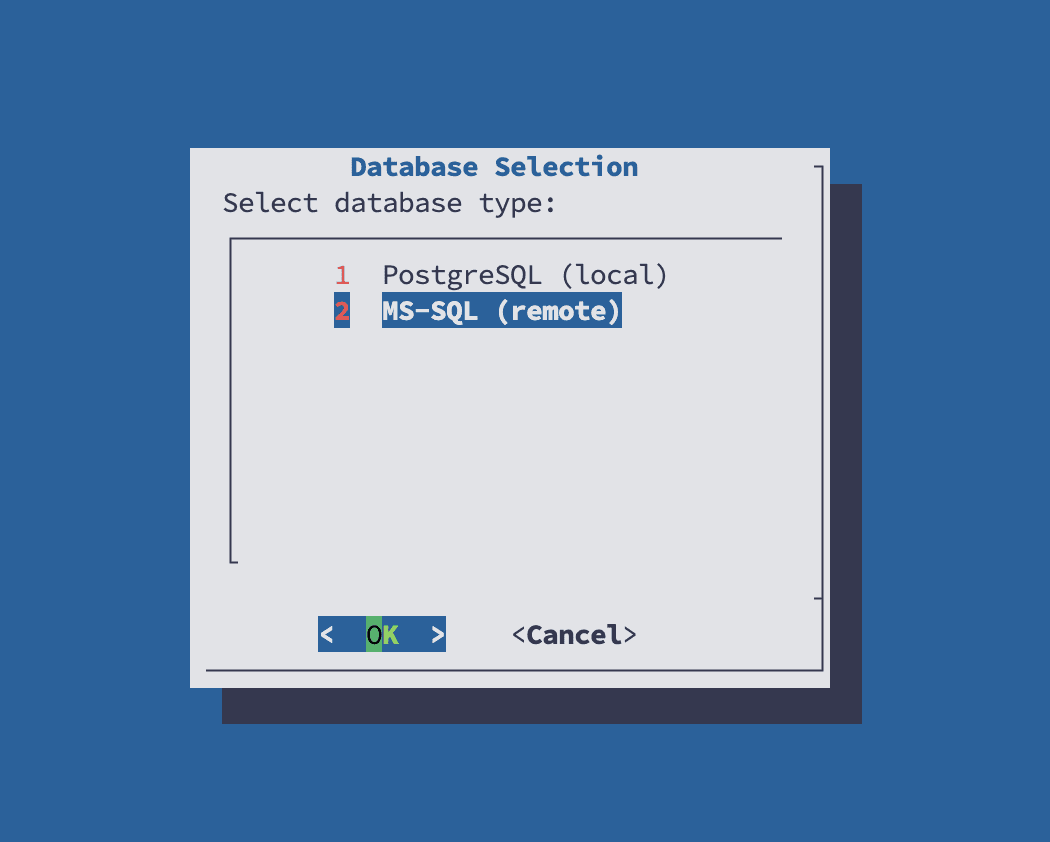 User your down arrow to highlight MS-SQL (remote) and press Enter to select the MS-SQL database to be used as the DashboardFox backend.