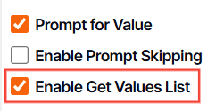 1. By default, Enable Get Values List is checked. A Values Report List helps you customize the values shown in your dropdown list or text field box. Instead of relying on the natural output of the data, you can specify what you want to appear.