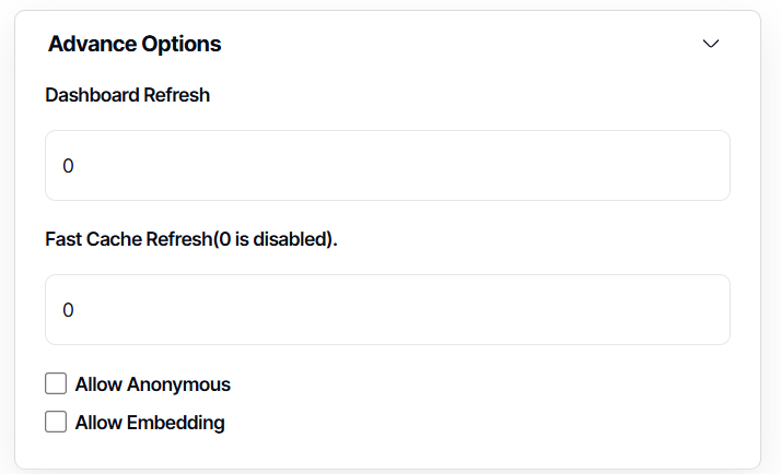 Dashboard Refresh (optional): We advise leaving the refresh rate as 0 to pull fresh data each time you load the dashboard. If you want your dashboard to auto-refresh while viewing, set the refresh frequency in seconds (we recommend no less than 60 seconds). If your use case is to display a dashboard on a big screen or public monitor, using the Display Mode feature is better than setting a refresh in this location.