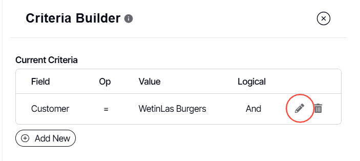 5. The Criteria Builder will appear. Under the Current Criteria, click on the edit button of the criteria you want to edit.
