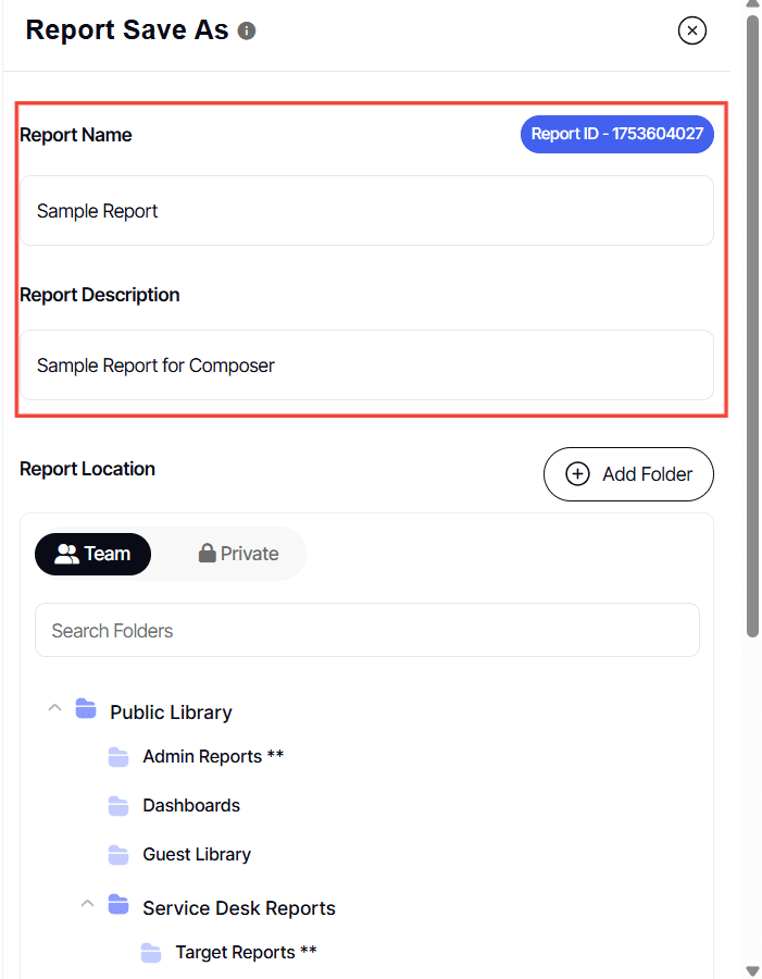 3. Choose where to save the report either the Team Library or Private Library as your save location.