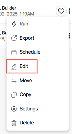 Editing reports able the user to configure the reports in the library such as data used or the structure of the report based on their preferences. The user must have a builder role and modify permission of that report.