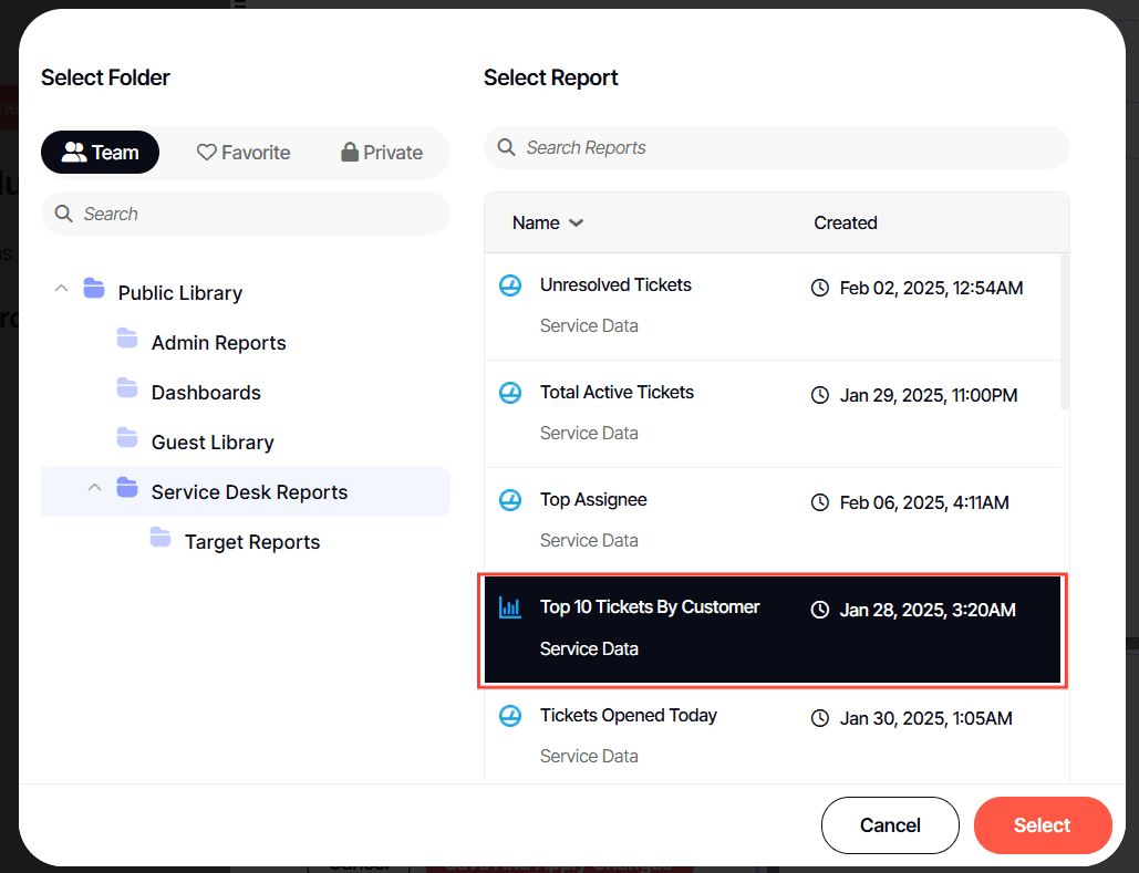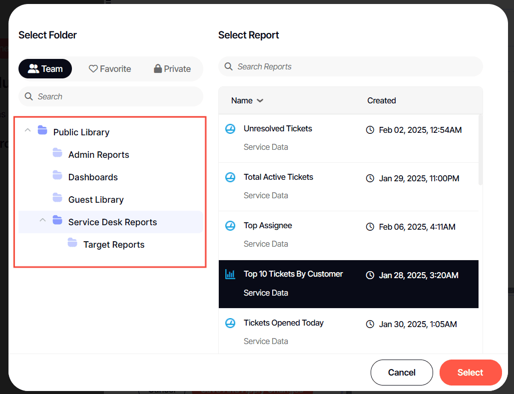 8. Select the folder where the report or dashboard you want to schedule is nestled in.