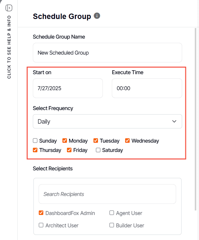 4. Configure the start on date, execution time and frequency of the scheduled group.