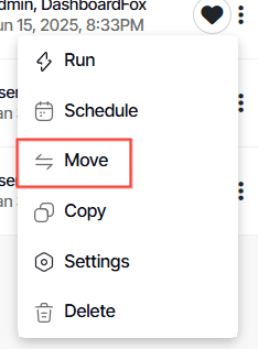 Note: You can only move reports or dashboards to a folder the logged in user has a modify permission to it. However, you can always move it to your own private library.