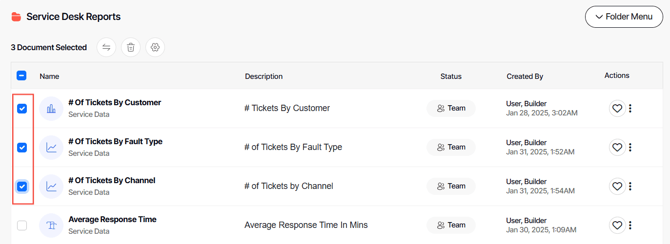 1. To move on or more library reports or dashboard, the logged in user must have Modify permission. You can check if you are allowed to make changes by clicking on a folder and selecting Folder Menu