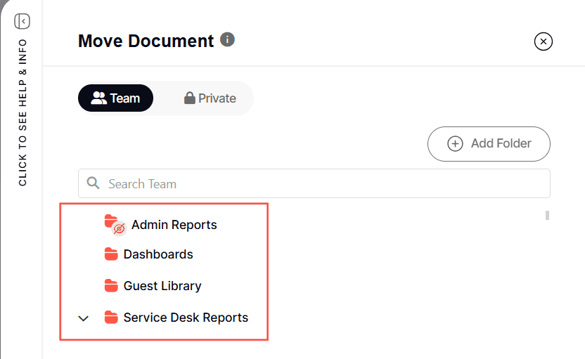 4. Select the subsection, folder, and any desired sub-folder where you wish to relocate your reports or dashboards