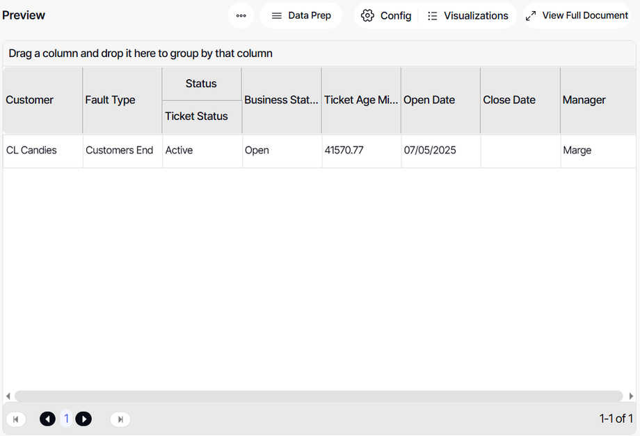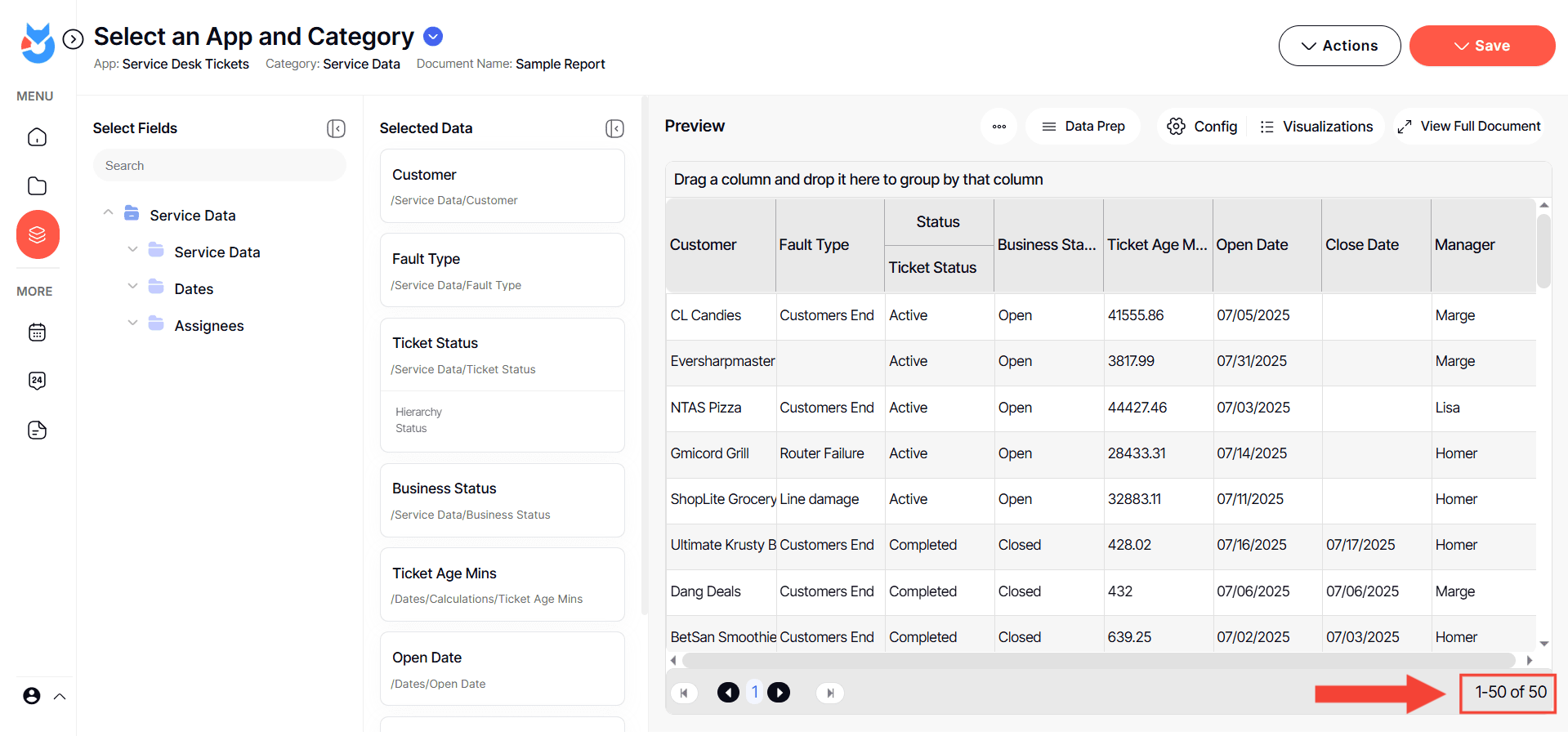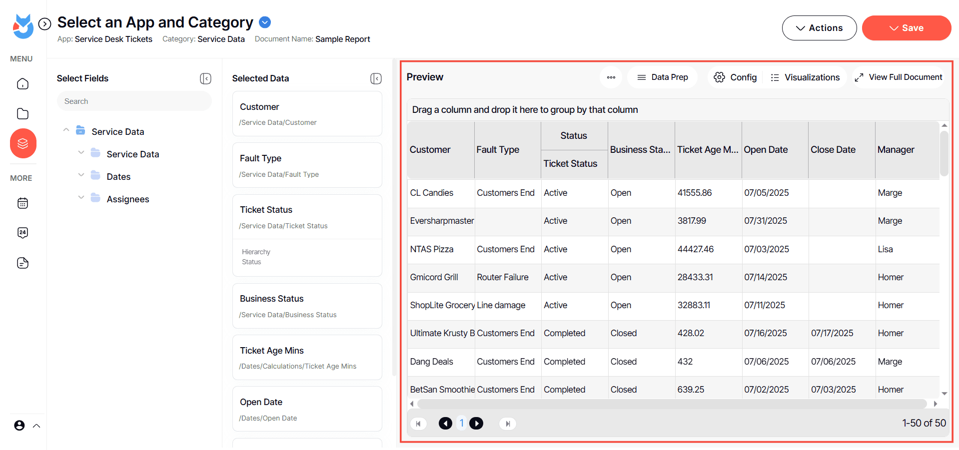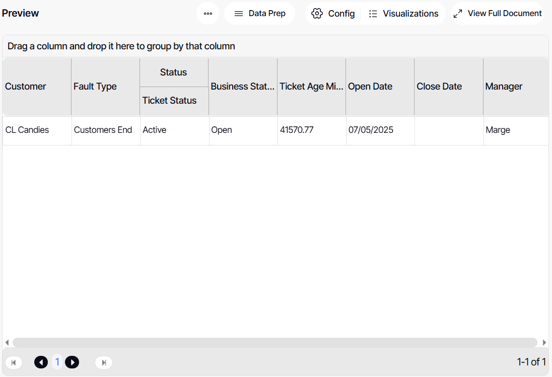 On the preview section, you can see the fields you added and configured. By default, it would show a standard output which is a data grid/table report.