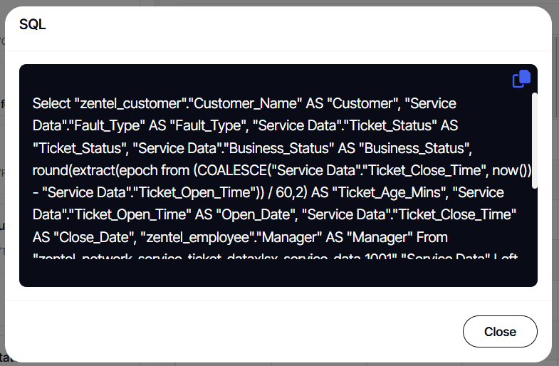 1. Clicking View SQL will display the commands used to retrieve data from a database for the report.